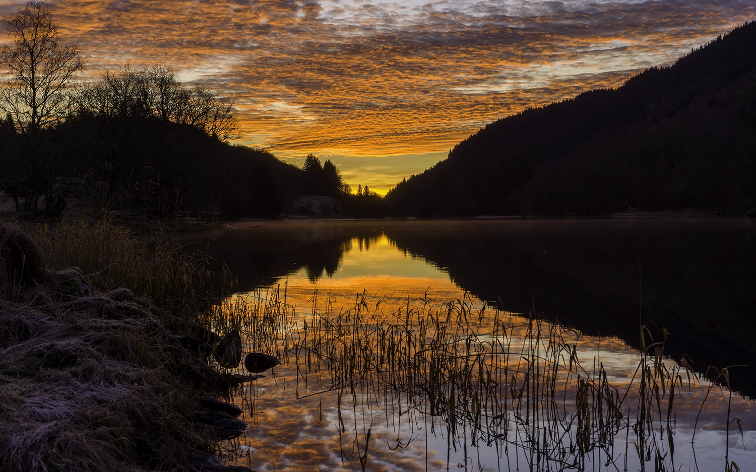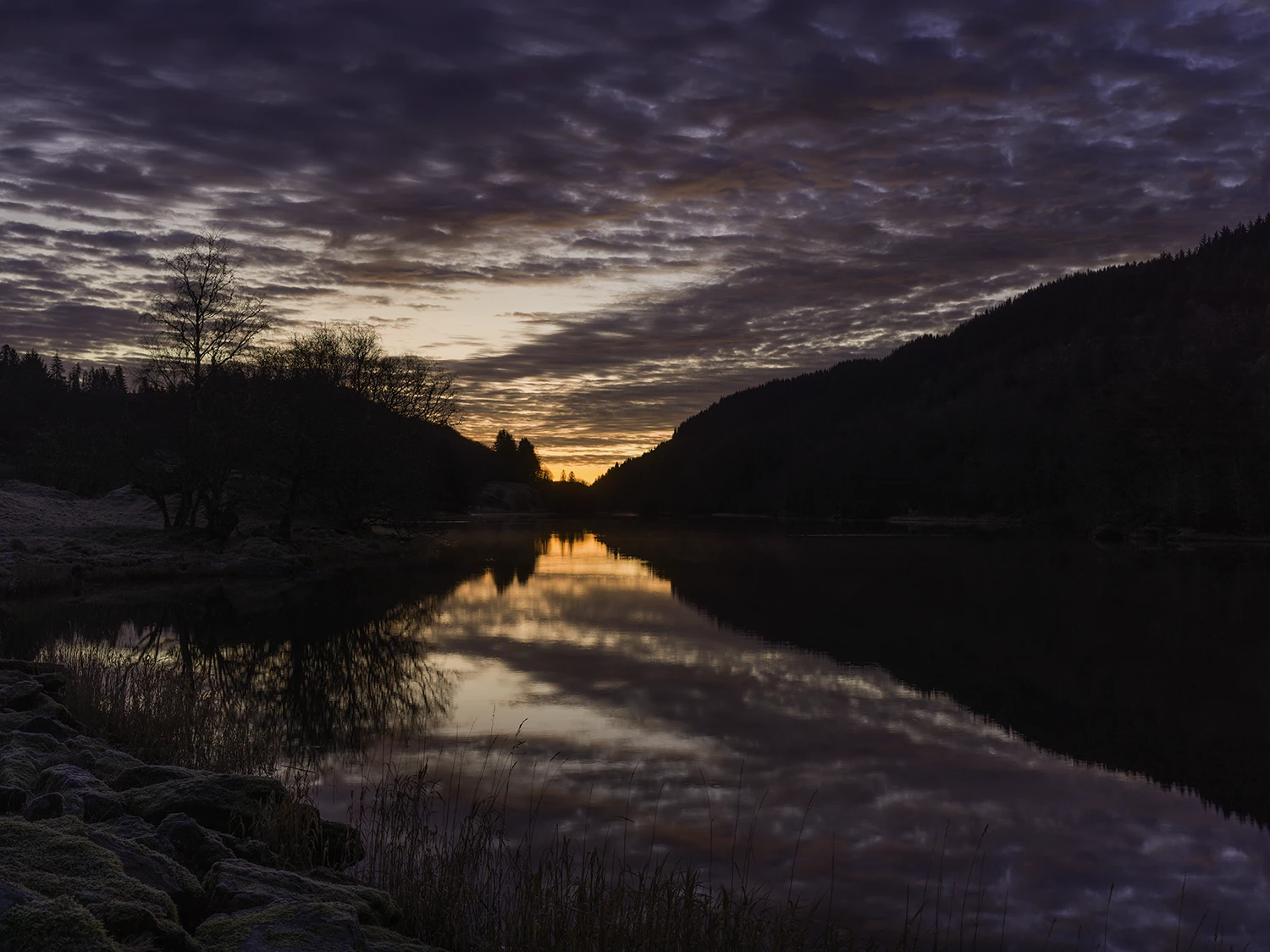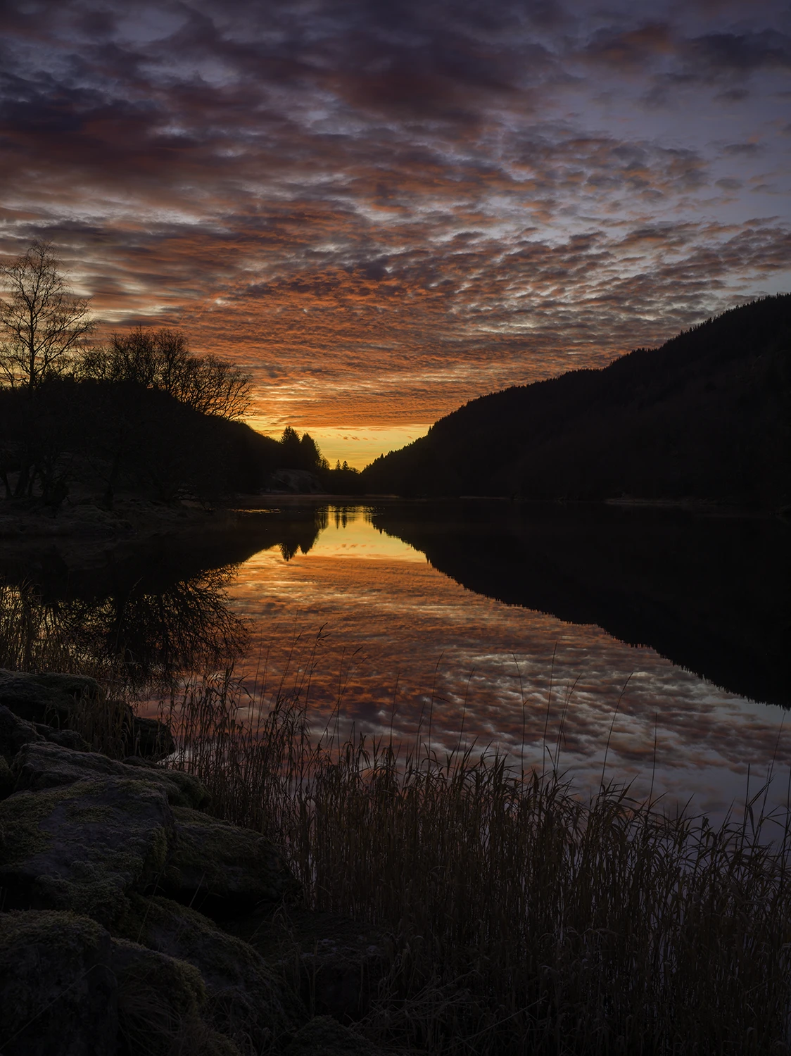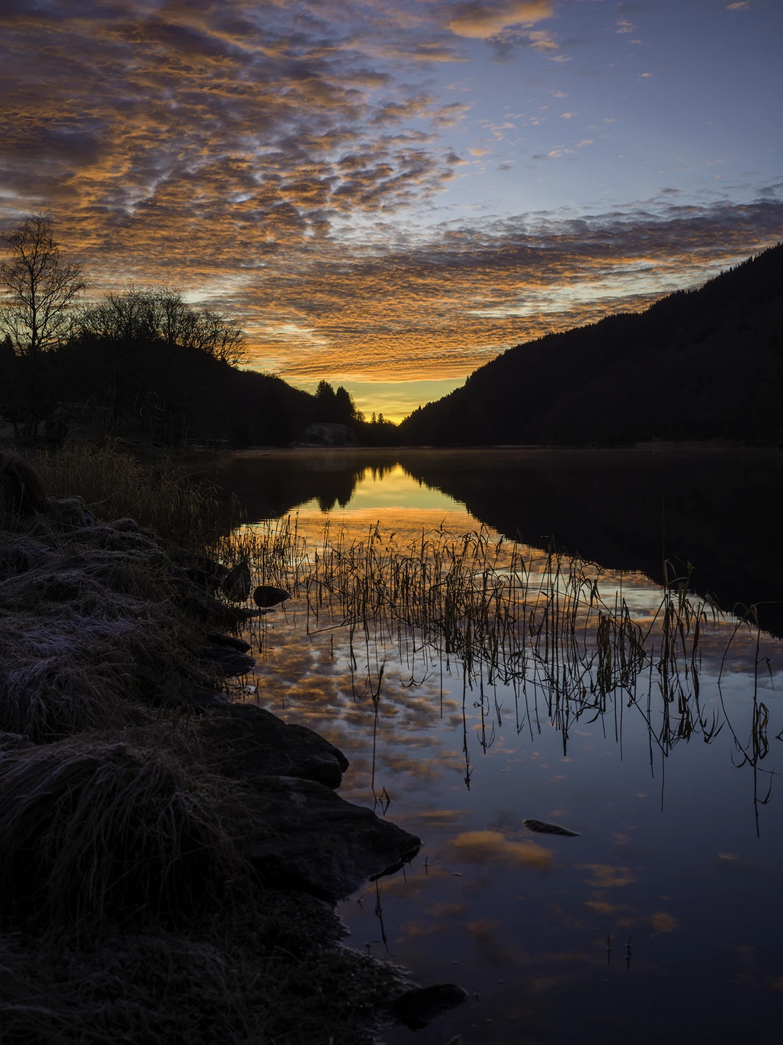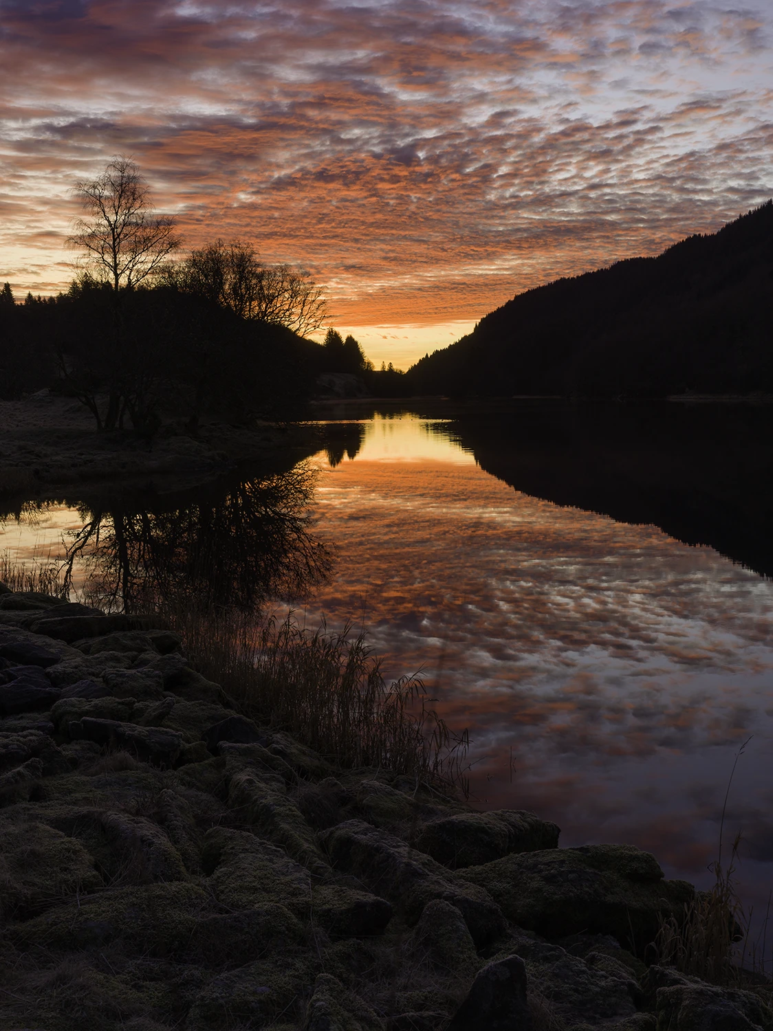 Så var det å finne komposisjonen. Fant ut at når kameraet var lavt og nærmest bakken, såg det best ut. Og nå skjedde forvandlingen kjapt. Lyset på himmelen ble mer og mer rødrosa. Alle som har vært med på dette vet at lyset plutselig dabber av og forsvinner. Her måtte jeg finne komposisjonen og ta bilder før lyset forsvant.